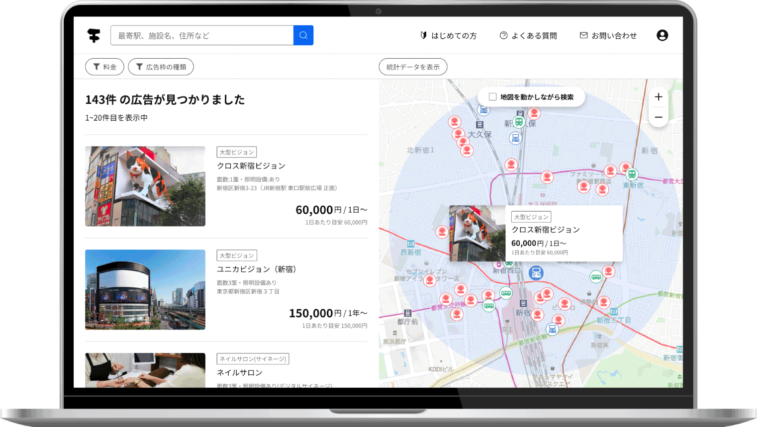 最寄りの駅名や住所、施設名などで、広告を出したいエリアを検索してみましょう。フィルタ機能を使って広告枠を絞り込むことも可能です。